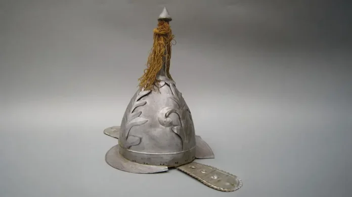 Обнаруженный экспонат выполнен из дюралевой белой жести, что делает его одновременно прочным и легким — подобная легкость особенно важна для сценического реквизита. Внешне этот предмет напоминает шлем древних воинов — его украшают декоративные пластины с изящным растительным узором. Функциональные элементы включают съемные наушники и козырьки, предназначенные для защиты лба и затылка. Венчает шлем вытянутый шпиль с декоративной головкой, украшенной шерстяными нитями насыщенного красно-бурого оттенка — такое украшение явно навеяно античными традициями и напоминает конский хвост. Судя по размеру, этот реквизит был рассчитан на подростка либо миниатюрного актера. Изделие почти не пострадало за долгие годы укрытия благодаря деликатности материалов и условиям хранения внутри стены.