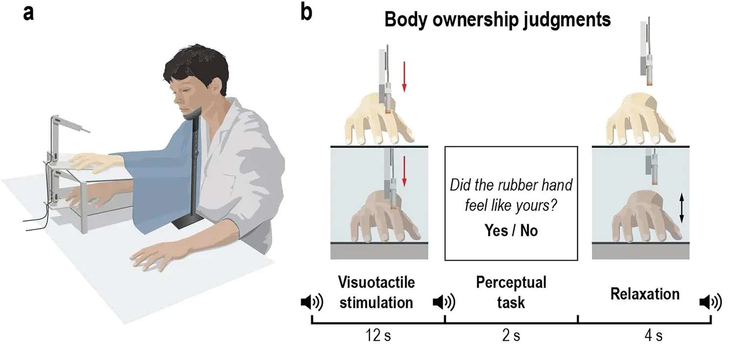 Эксперты использовали классическую "иллюзию резиновой руки", усовершенствовав ее для высокой точности. Роботизированные устройства наносили ритмичные касания одновременно по скрытой от взгляда реальной руке участника и по видимому резиновому макету. Ученые варьировали задержку между касаниями с миллисекундной точностью, определяя момент, когда иллюзия владения резиновой рукой исчезала.