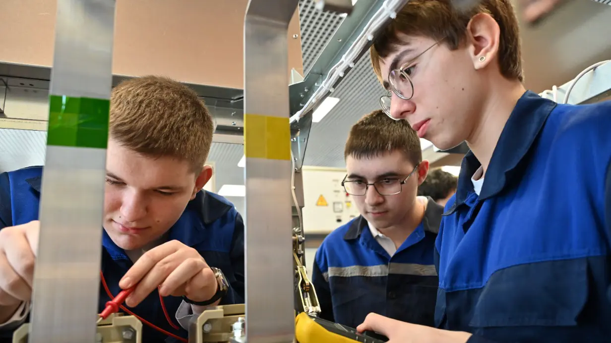 Студенты первого курса Колледжа связи № 54 им. П. М. Вострухина Виктор Оськин, Алан Уртаев и Дмитрий Лысков, используя мультиметр, прозванивают контакты на трансформаторе понижающего типа в новой лаборатории, которая воссоздает городскую электроподстанцию